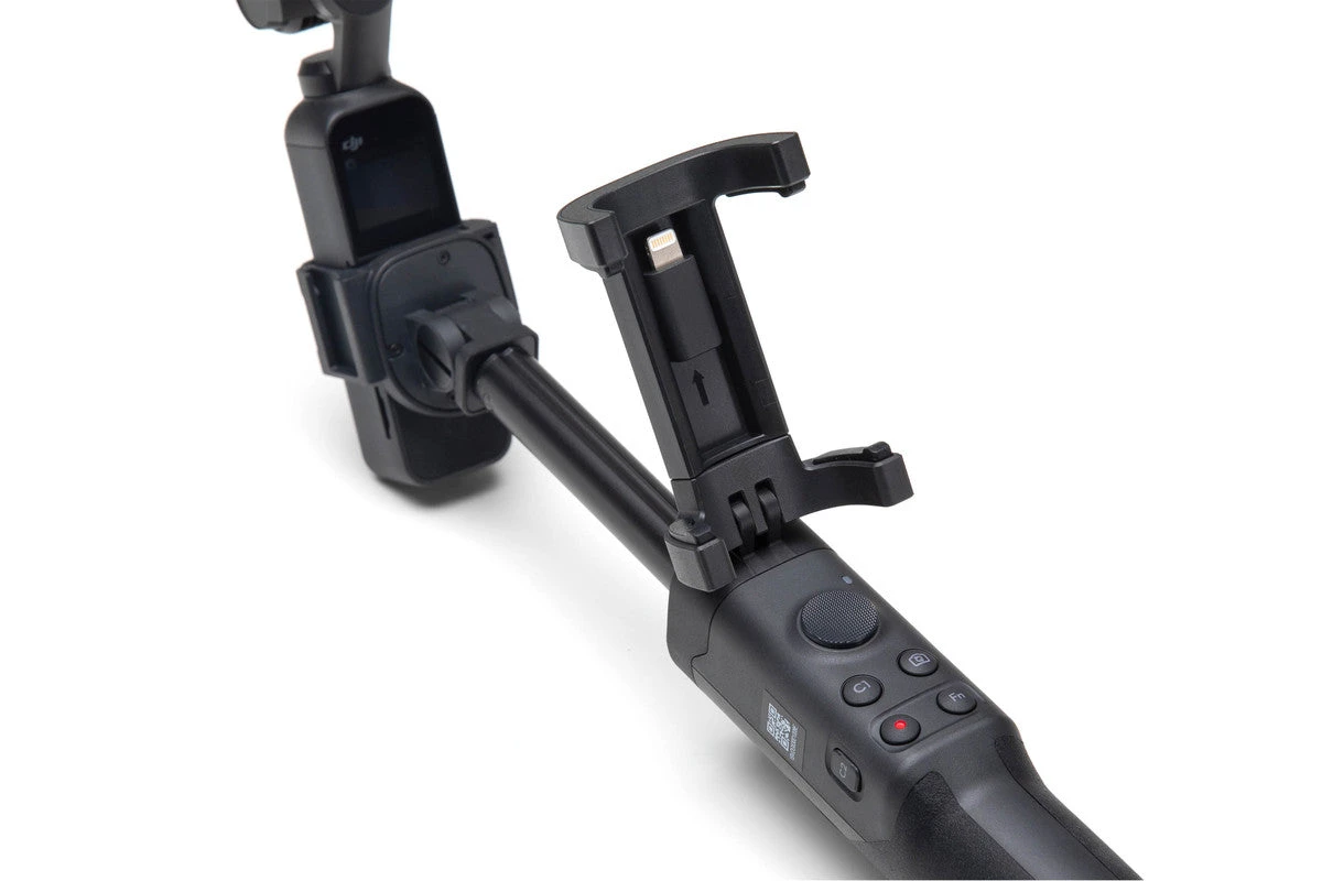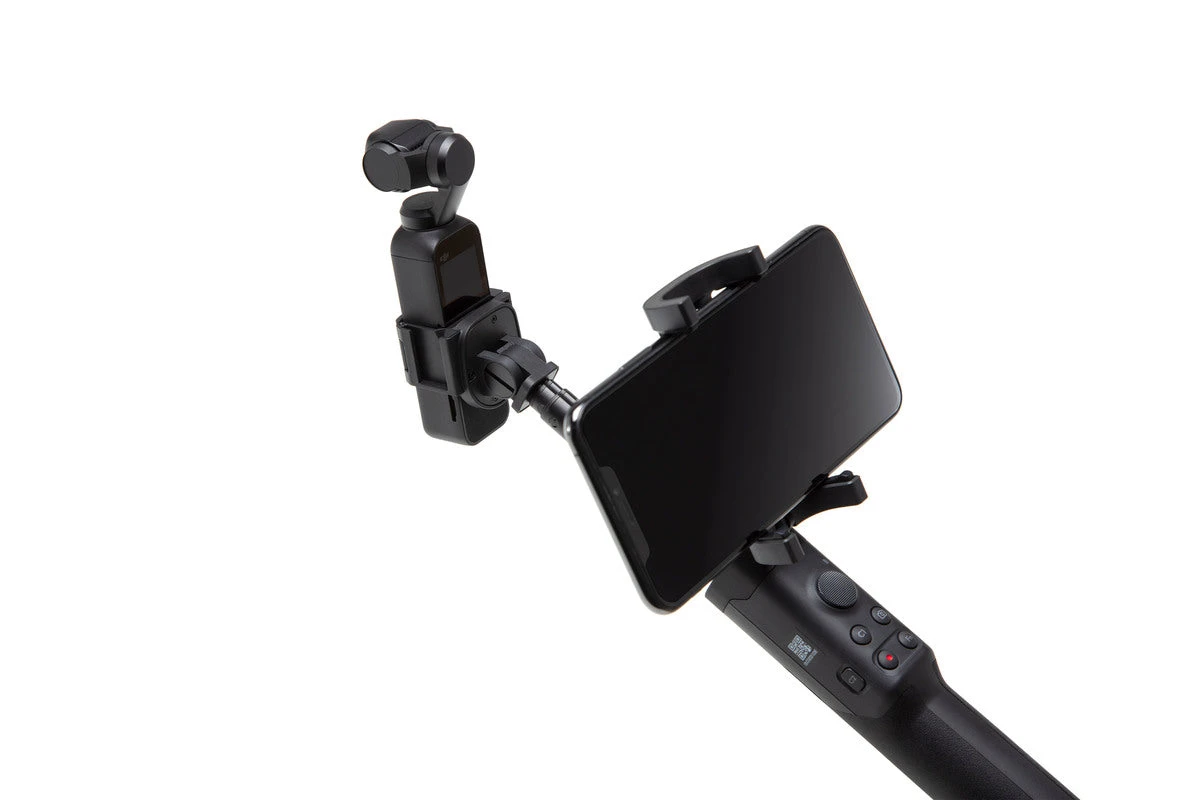 You can attach your phone to the phone holder, and use an Osmo Pocket Wireless Module or a connection cable (both sold independently) to control Osmo Pocket with the extension rod. The extension rod also features multiple mounting brackets for additional shooting options.